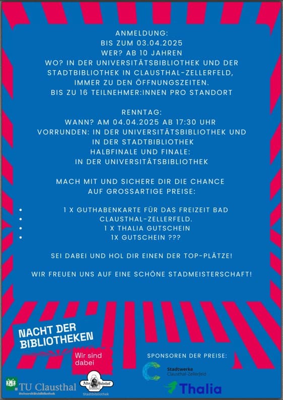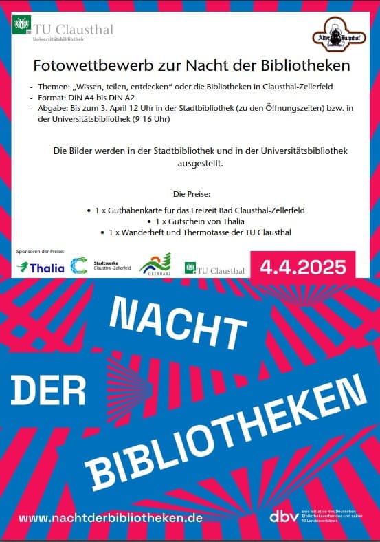 Hier erfahren Sie alles über die Veranstaltungen während der "Nacht der Bibliotheken" in der Stadbibliothek Clausthal-Zellerfeld. Ein Besuch lohnt sich.